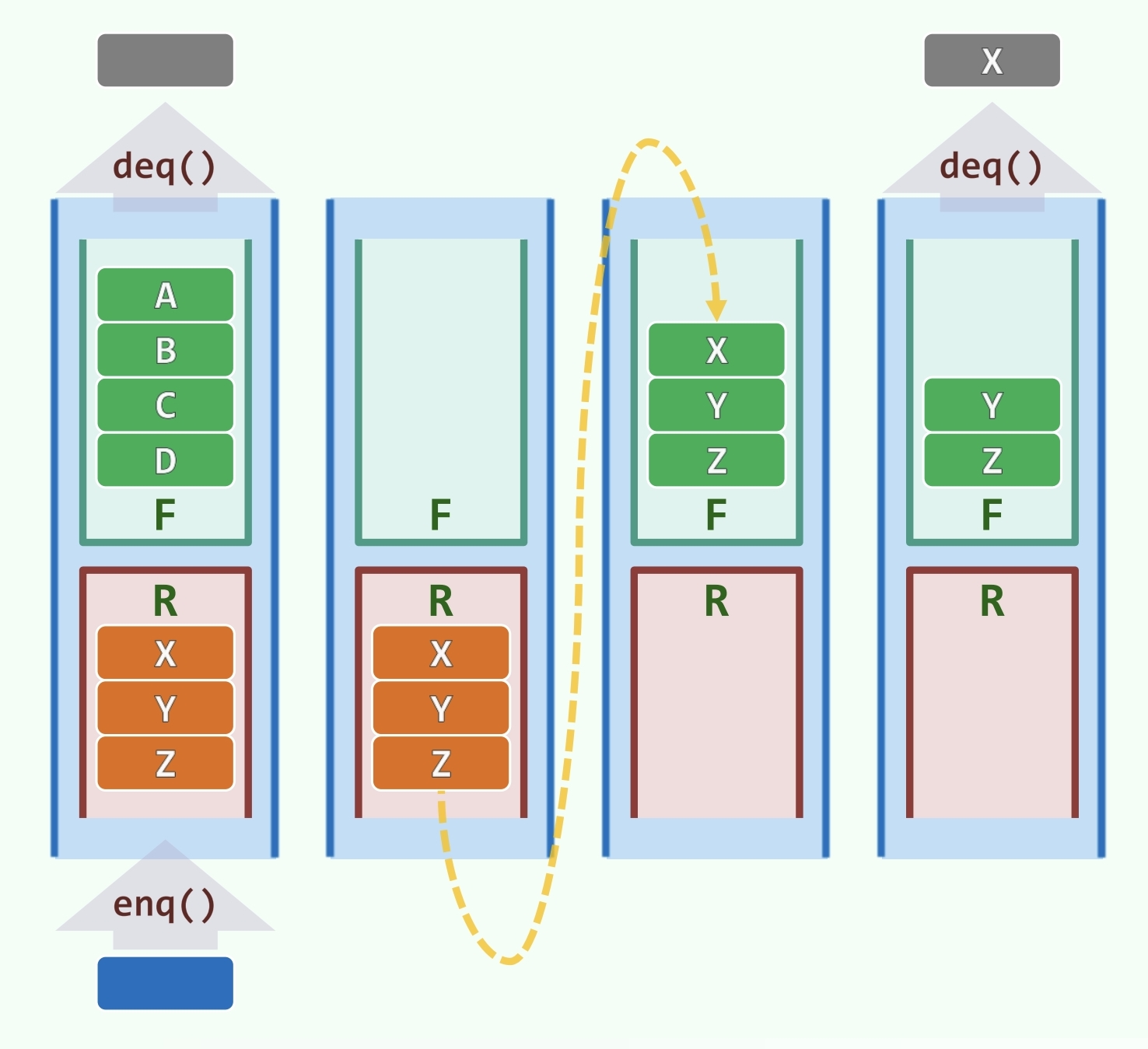 • 出队时,若 F 不为空,弹出 F 栈顶元素,若 F 为空,逐个将 R 栈顶元素压入 F 中,可以保证 F 中的元素顺序与 R 的入栈顺序相同
