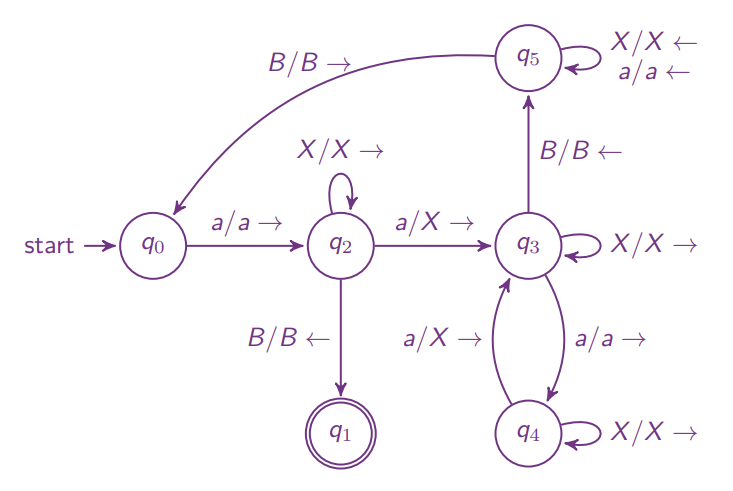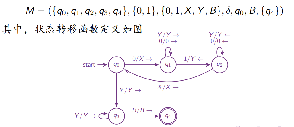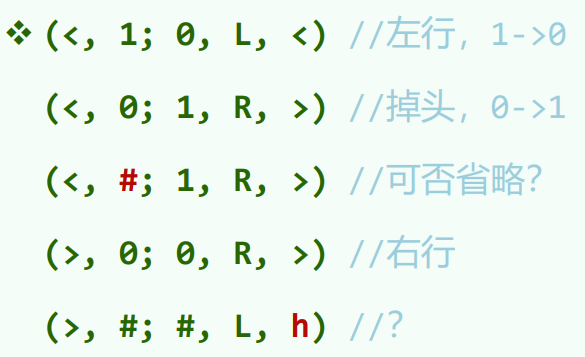 - Alphabet:语言,有限种符号 Transition Function: 当前状态为,字符为,将当前字符修改为,读写头向左或向右移动,状态修改为