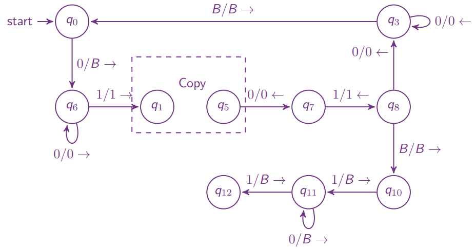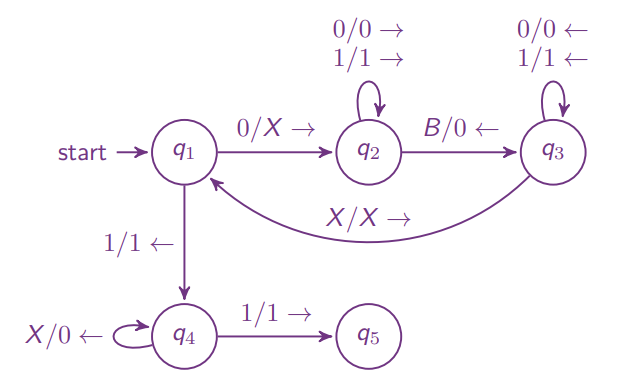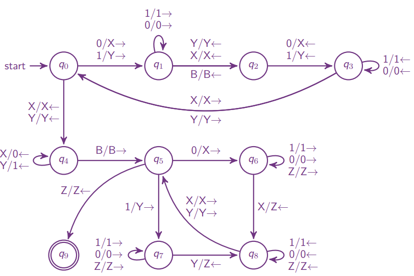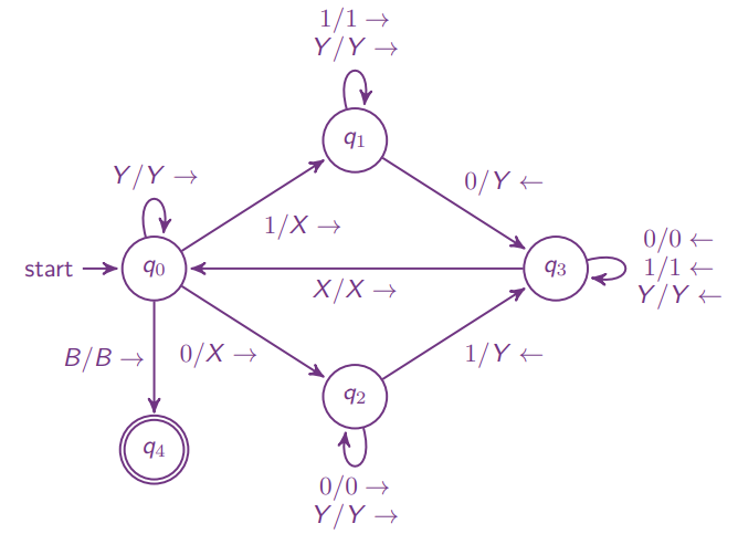 每次匹配将最左侧未匹配的 0 标记为 X,然后找到第一个未匹配的 1 标记为 Y,反向再找到最靠右的 X,重复。 表示 0 和 1 数量相同的状态,若下一个元素已经是 Y,即已经匹配完,则移动到串的末尾并接受
