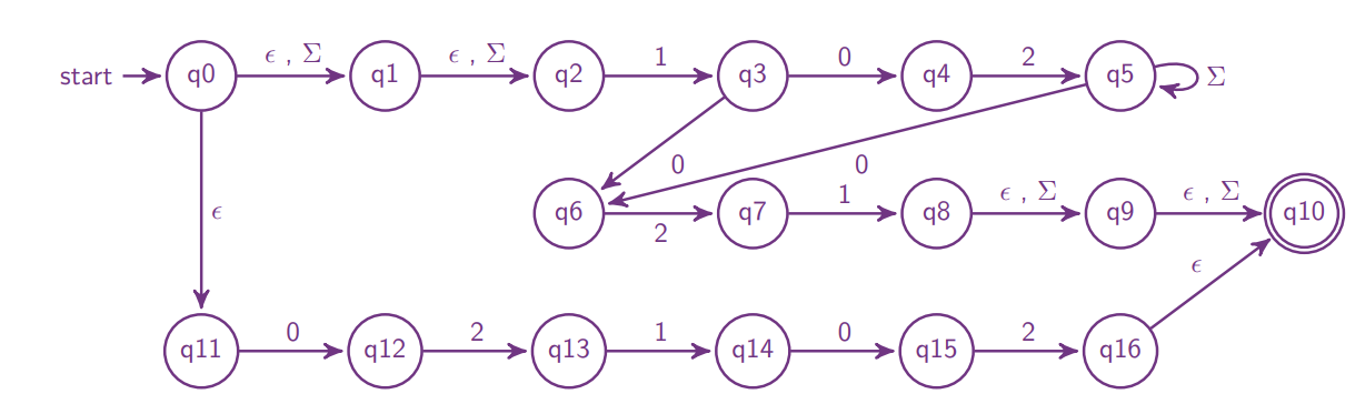 \usetikzlibrary{automata, positioning, arrows}\tikzset{ ->, % makes the edges directed >=stealth, % makes the arrow heads bold node distance=2.5cm, % specifies the minimum distance between two nodes. Change if necessary. every state/.style={thick}, % sets the properties for each ’state’ node initial text=$Start$, % sets the text that appears on the start arrow}\begin{document} \begin{tikzpicture} \node [state, initial] (q0) {$q_0$}; \node [state, right of = q0] (q1) {$q_1$}; \node [state, right of = q1] (q2) {$q_2$}; \node [state, right of = q2] (q3) {$q_3$}; \node [state, right of = q3, accepting] (q4) {$q_4$}; \draw (q0) edge[above] node{0,1,2} (q1) (q1) edge[above] node{$\epsilon$,0,1,2} (q2) (q2) edge[above] node{$\epsilon$,0,1,2} (q3) (q3) edge[above] node{0} (q4) (q4) edge[loop above, above] node{0,1,2} (q4); \end{tikzpicture}\end{document}