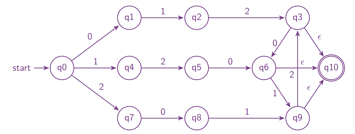 \usetikzlibrary{automata, positioning, arrows}\tikzset{ ->, % makes the edges directed >=stealth, % makes the arrow heads bold node distance=2.5cm, % specifies the minimum distance between two nodes. Change if necessary. every state/.style={thick}, % sets the properties for each ’state’ node initial text=$Start$, % sets the text that appears on the start arrow}\begin{document} \begin{tikzpicture} \node [state, initial] (q0) {$q_0$}; \node [state, right of = q0] (q1) {$q_1$}; \node [state, right of = q1] (q2) {$q_2$}; \node [state, right of = q2, accepting] (q3) {$q_3$}; \draw (q0) edge[loop above, above] node{0,1,2} () (q0) edge[above] node{0,1} (q1) (q1) edge[above] node{$\epsilon$,0,1,2} (q2) (q2) edge[above] node{$\epsilon$,0,1,2} (q3); \end{tikzpicture}\end{document}