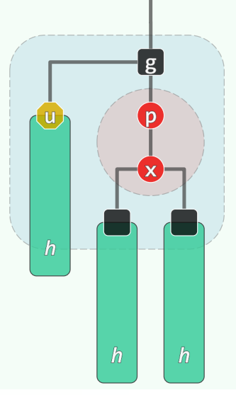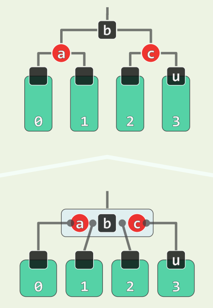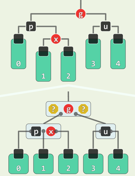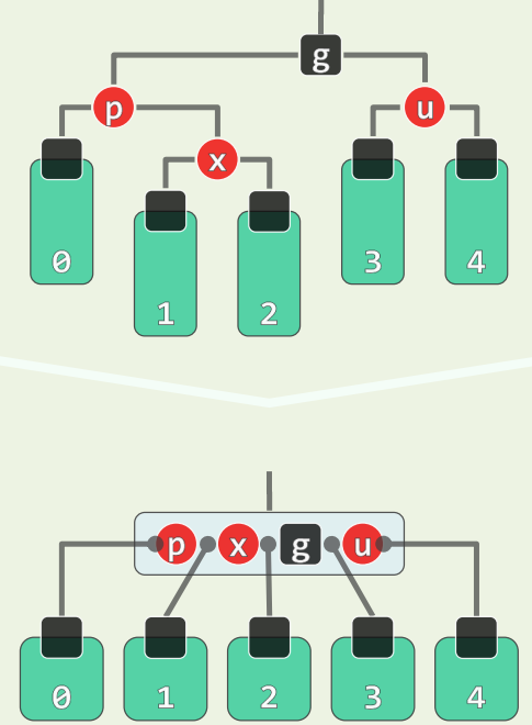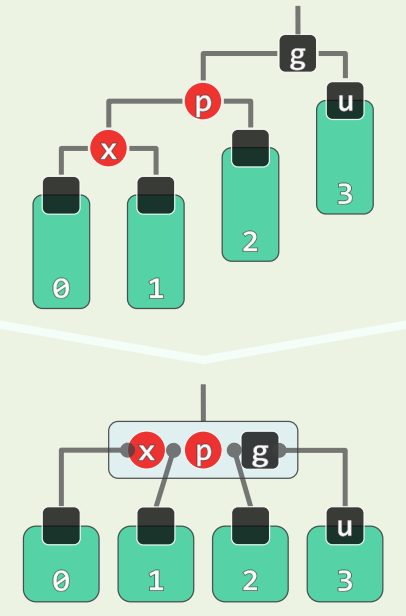 • 若 u 为黑,视为 B 树,相当于 x,p,g 超级节点中黑节点不居中,只需旋转后重新染色即可立即完成修复