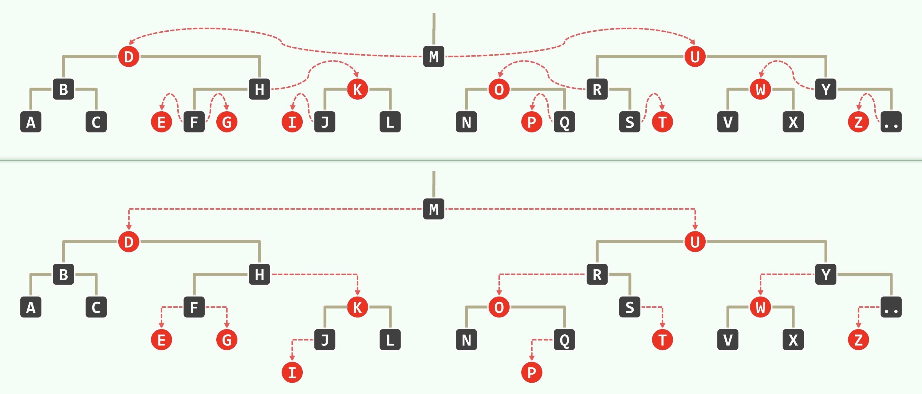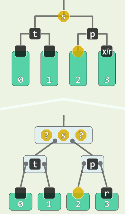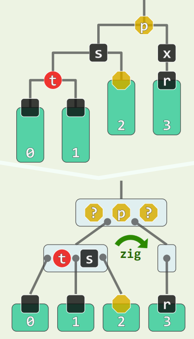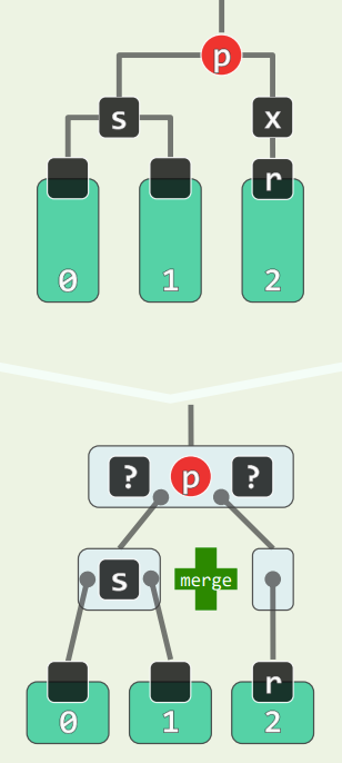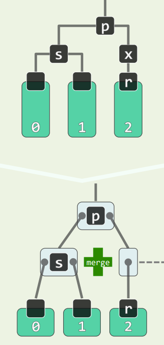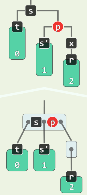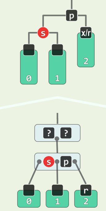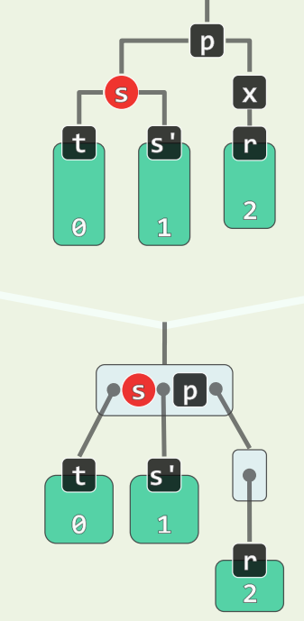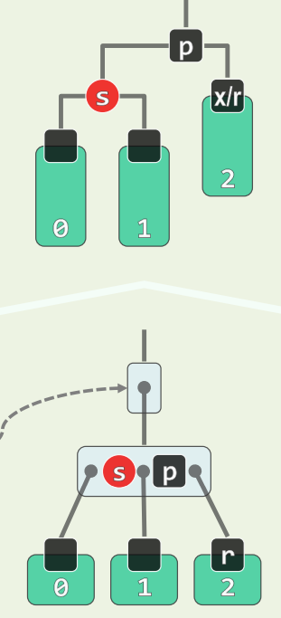 - s 为黑,且两个孩子均为黑,p 为黑,看作 B 树,相当于 p 下移,且 p 原本在的超级节点**必然**继续下溢,至多传播 $O(\log n)$ 层 - 此处只有红黑树的**局部性质**得到了恢复
