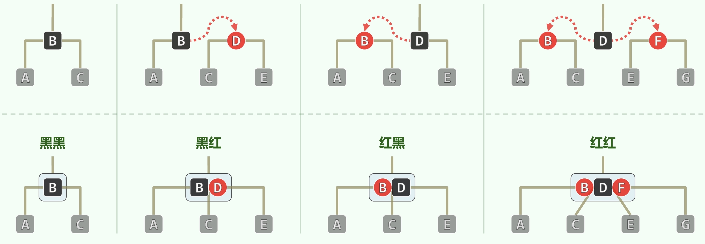 • 对于只有 1 个或 3 个关键码的节点,只能唯一对应一种红黑树的节点情况