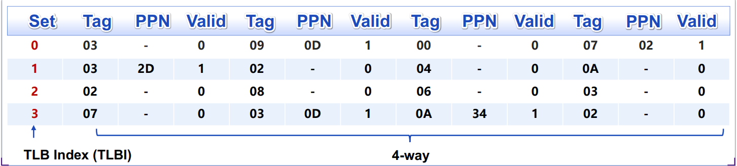 若 TLB 有 个组, 项(称为 路组相连),则 TLB 索引 TLBI 是由虚拟页号 VPN 的低 位构成的,VPN 的剩余位(高 位)构成 TLB 标记 TLBT。