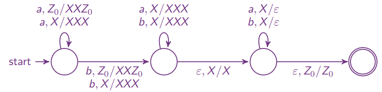 考虑以终态接受的方式构造 PDA。 遇到 a 向栈中压入元素,遇到 b 时弹出元素。为了实现 a 的数量至少 2 倍于 b,应该每次弹出 2 个元素,可以通过引入 实现。